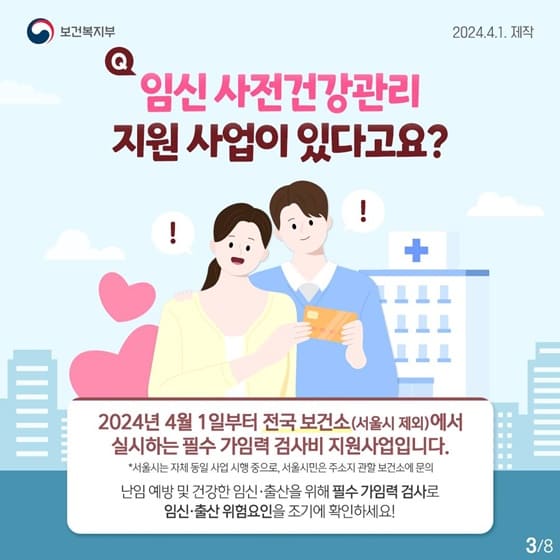 **임신 사전건강관리 지원사업**은 임신 전 건강 상태를 미리 확인해 안전하고 건강한 임신을 돕는 정부 복지 서비스입니다.
