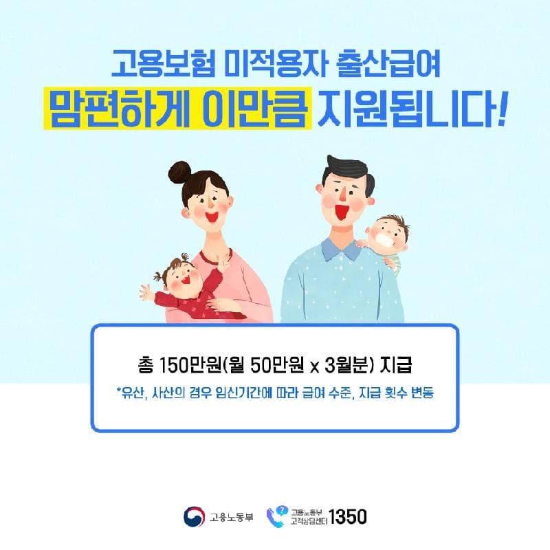 - 대상자: 고용보험에 가입되지 않은 프리랜서, 1인 사업자(부동산임대 제외), 특수형태근로자(골프장 캐디·보험설계사·퀵서비스 등) 출산 또는 유산·사산 여성