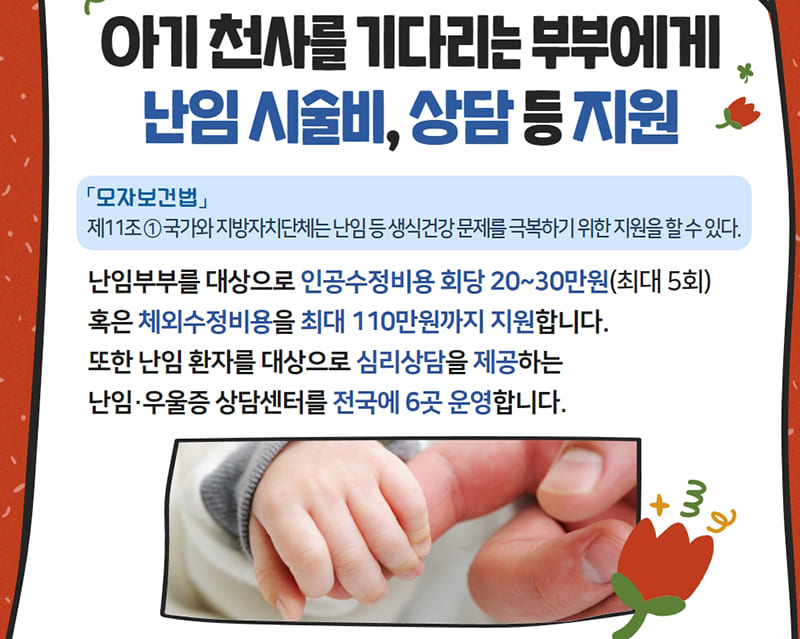 - 난임 판정을 받은 경우, 시술비 지원뿐 아니라 무료 심리상담도 받을 수 있으니 꼭 신청하세요.